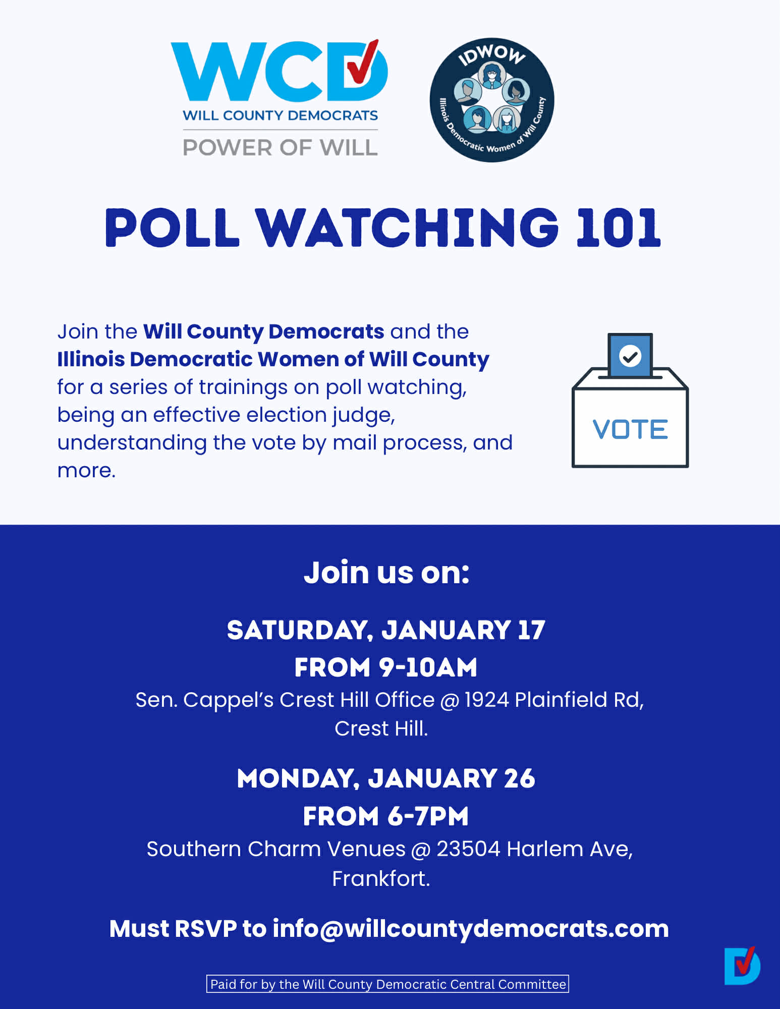 Must RSVP to info@willcountydemocrats.com