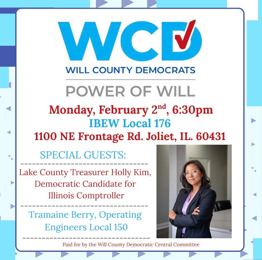 Disclaimer: Authorized and paid for by the Will County Democratic Central Cmte. A copy of our report filed with the State Board of Elections is (or will be) available on the Board’s official website (www.elections.il.gov) or for purchase from the State Board of Elections, Springfield, Illinois.